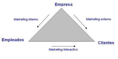 Englobado en esta filosofía, se produce una relación triangular entre los 3 agentes interesados en la comunicación empresarial, es decir: la empresa, los clientes y los trabajadores; siendo el marketing interno la columna vertebradora en la que se cimientan las bases de la relación empresa-trabajadores, como se puede observar en la imagen de la derecha.