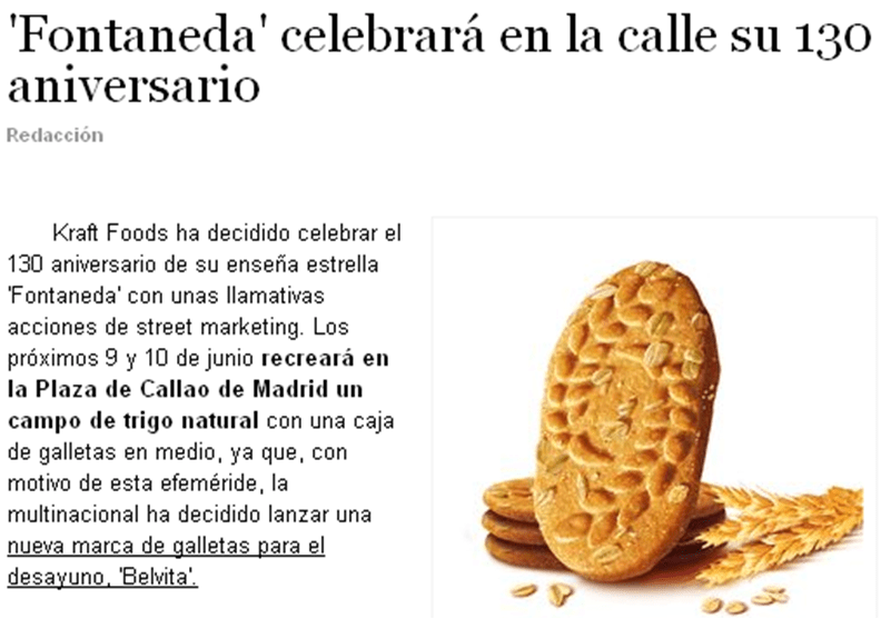 En la siguiente imagen podéis ver un claro ejemplo de publicity real, en el que se observa como en un periódico escrito se refleja una noticia sobre una serie de eventos para celebrar el anivrsario y el lanzamiento de un nuevo producto de una conocida marca de galletas.