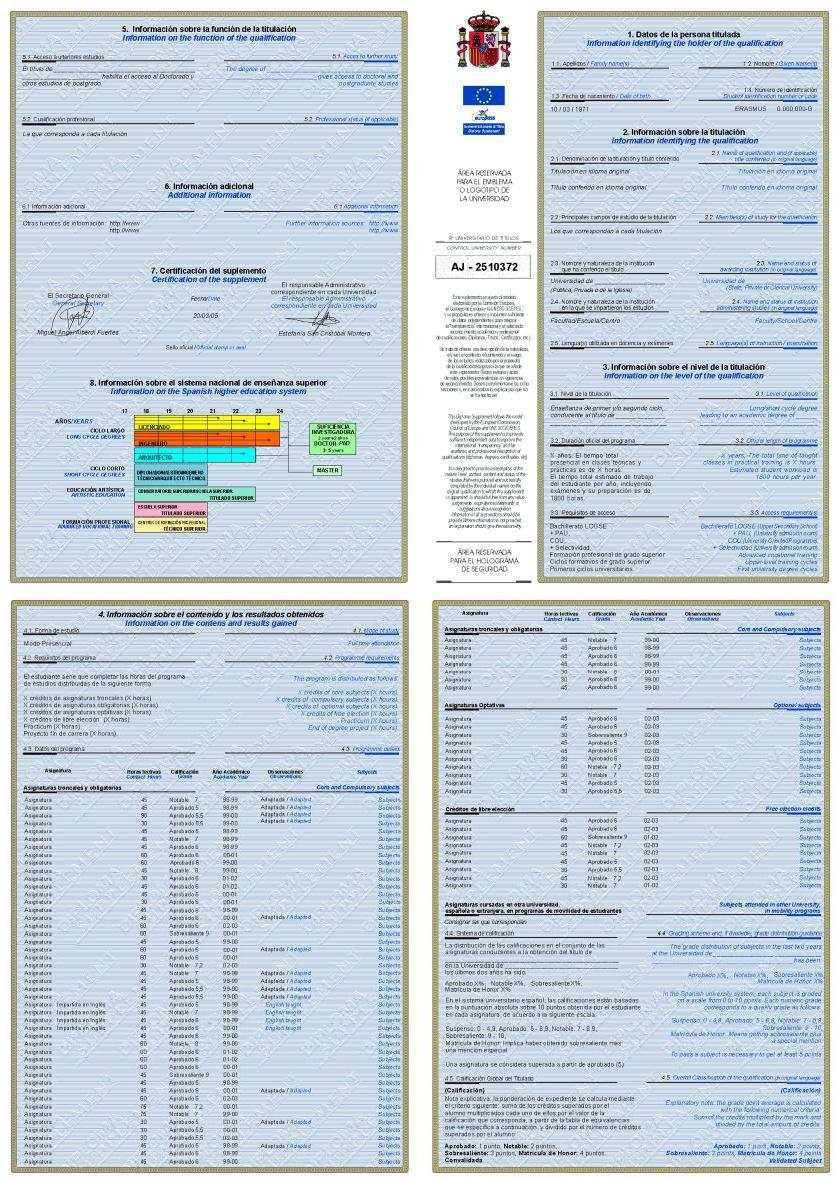 El modelo, elaborado por la Comisión Europea, el Consejo de Europa y UNESCO/CEPES (Centro Europeo para la Enseñanza Superior) debe contener la siguiente información:
